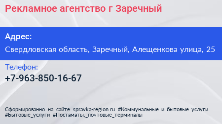 Рекламное агентство, г. Заречный по адресу Свердловская область, Заречный, Алещенкова улица, 25 в дальнейшем Организация, размещена в следующих категориях: