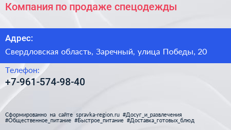 Компания по продаже спецодежды по адресу Свердловская область, Заречный, улица Победы, 20 в дальнейшем Организация, размещена в следующих категориях: