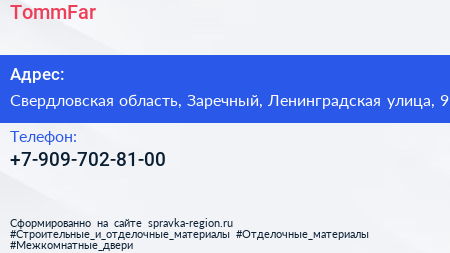 TommFar по адресу Свердловская область, Заречный, Ленинградская улица, 9 в дальнейшем Организация, размещена в следующих категориях: