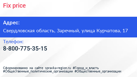 Fix price по адресу Свердловская область, Заречный, улица Курчатова, 17 в дальнейшем Организация, размещена в следующих категориях: