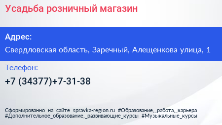 Усадьба, розничный магазин по адресу Свердловская область, Заречный, Алещенкова улица, 1 в дальнейшем Организация, размещена в следующих категориях: