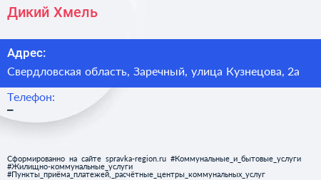 Дикий Хмель по адресу Свердловская область, Заречный, улица Кузнецова, 2а в дальнейшем Организация, размещена в следующих категориях: