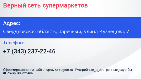 Верный, сеть супермаркетов по адресу Свердловская область, Заречный, улица Кузнецова, 7 в дальнейшем Организация, размещена в следующих категориях: