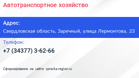 Автотранспортное хозяйство по адресу Свердловская область, Заречный, улица Лермонтова, 23 в дальнейшем Организация, размещена в следующих категориях: