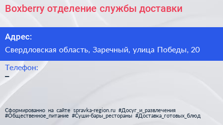 Boxberry, отделение службы доставки по адресу Свердловская область, Заречный, улица Победы, 20 в дальнейшем Организация, размещена в следующих категориях: