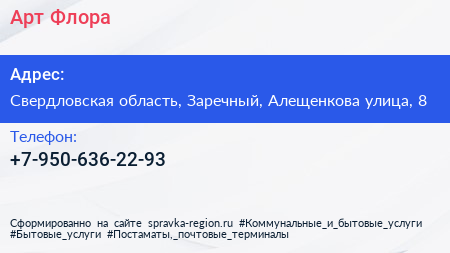 Арт-Флора по адресу Свердловская область, Заречный, Алещенкова улица, 8 в дальнейшем Организация, размещена в следующих категориях: