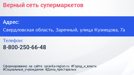 Верный, сеть супермаркетов по адресу Свердловская область, Заречный, улица Кузнецова, 7а в дальнейшем Организация, размещена в следующих категориях: