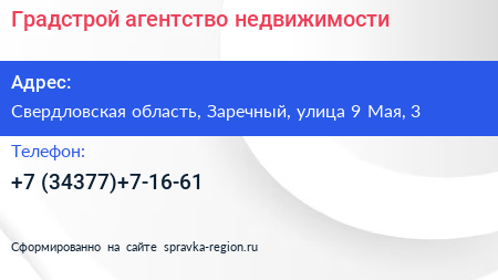 Градстрой, агентство недвижимости по адресу Свердловская область, Заречный, улица 9 Мая, 3 в дальнейшем Организация, размещена в следующих категориях: