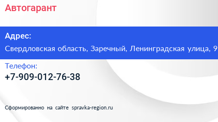 Автогарант по адресу Свердловская область, Заречный, Ленинградская улица, 9 в дальнейшем Организация, размещена в следующих категориях: