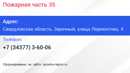Пожарная часть №35 по адресу Свердловская область, Заречный, улица Лермонтова, 4 в дальнейшем Организация, размещена в следующих категориях: