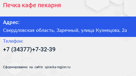 Печка, кафе-пекарня по адресу Свердловская область, Заречный, улица Кузнецова, 2а в дальнейшем Организация, размещена в следующих категориях: