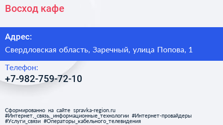 Восход, кафе по адресу Свердловская область, Заречный, улица Попова, 1 в дальнейшем Организация, размещена в следующих категориях: