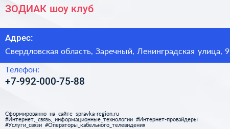 ЗОДИАК, шоу-клуб по адресу Свердловская область, Заречный, Ленинградская улица, 9 в дальнейшем Организация, размещена в следующих категориях: