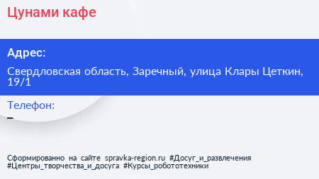 Цунами, кафе по адресу Свердловская область, Заречный, улица Клары Цеткин, 19/1 в дальнейшем Организация, размещена в следующих категориях: