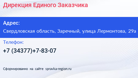 Дирекция Единого Заказчика по адресу Свердловская область, Заречный, улица Лермонтова, 29а в дальнейшем Организация, размещена в следующих категориях: