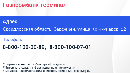 Газпромбанк, терминал по адресу Свердловская область, Заречный, улица Коммунаров, 12 в дальнейшем Организация, размещена в следующих категориях: