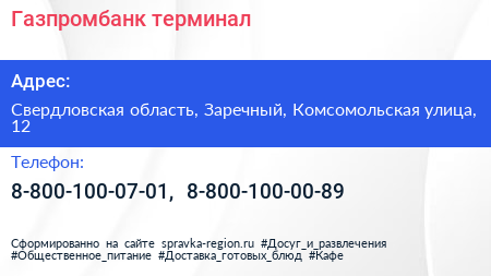 Газпромбанк, терминал по адресу Свердловская область, Заречный, Комсомольская улица, 12 в дальнейшем Организация, размещена в следующих категориях: