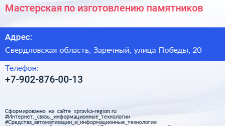 Мастерская по изготовлению памятников по адресу Свердловская область, Заречный, улица Победы, 20 в дальнейшем Организация, размещена в следующих категориях:
