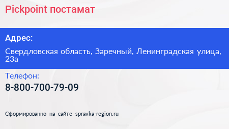 Pickpoint, постамат по адресу Свердловская область, Заречный, Ленинградская улица, 23а в дальнейшем Организация, размещена в следующих категориях: