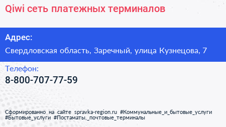 Qiwi, сеть платежных терминалов по адресу Свердловская область, Заречный, улица Кузнецова, 7 в дальнейшем Организация, размещена в следующих категориях: