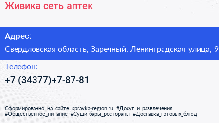 Живика, сеть аптек по адресу Свердловская область, Заречный, Ленинградская улица, 9 в дальнейшем Организация, размещена в следующих категориях: