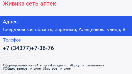 Живика, сеть аптек по адресу Свердловская область, Заречный, Алещенкова улица, 8 в дальнейшем Организация, размещена в следующих категориях: