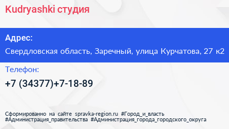 Kudryashki, студия по адресу Свердловская область, Заречный, улица Курчатова, 27 к2 в дальнейшем Организация, размещена в следующих категориях: