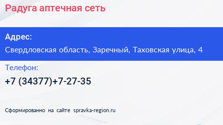 Радуга, аптечная сеть по адресу Свердловская область, Заречный, Таховская улица, 4 в дальнейшем Организация, размещена в следующих категориях: