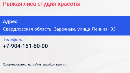 Рыжая лиса, студия красоты по адресу Свердловская область, Заречный, улица Ленина, 33 в дальнейшем Организация, размещена в следующих категориях: