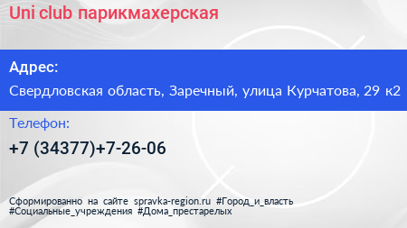 Uni club, парикмахерская по адресу Свердловская область, Заречный, улица Курчатова, 29 к2 в дальнейшем Организация, размещена в следующих категориях: