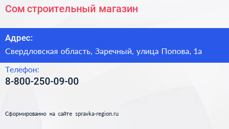 Сом, строительный магазин по адресу Свердловская область, Заречный, улица Попова, 1а в дальнейшем Организация, размещена в следующих категориях: