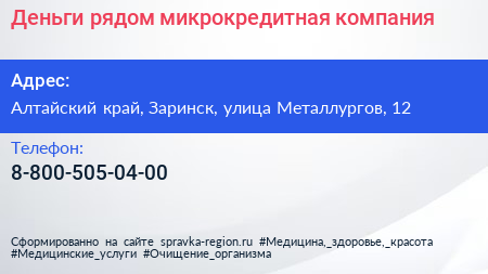 Деньги рядом, микрокредитная компания по адресу Алтайский край, Заринск, улица Металлургов, 12 в дальнейшем Организация, размещена в следующих категориях: