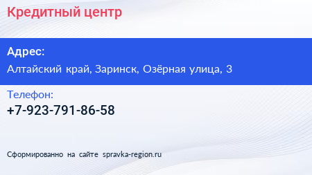 Кредитный центр по адресу Алтайский край, Заринск, Озёрная улица, 3 в дальнейшем Организация, размещена в следующих категориях: