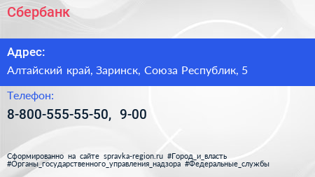 Сбербанк по адресу Алтайский край, Заринск, Союза Республик, 5 в дальнейшем Организация, размещена в следующих категориях: