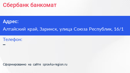 Сбербанк, банкомат по адресу Алтайский край, Заринск, улица Союза Республик, 16/1 в дальнейшем Организация, размещена в следующих категориях: