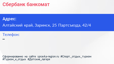 Сбербанк, банкомат по адресу Алтайский край, Заринск, 25 Партсъезда, 42/4 в дальнейшем Организация, размещена в следующих категориях: