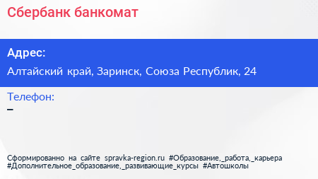 Сбербанк, банкомат по адресу Алтайский край, Заринск, Союза Республик, 24 в дальнейшем Организация, размещена в следующих категориях: