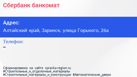 Сбербанк, банкомат по адресу Алтайский край, Заринск, улица Горького, 26а в дальнейшем Организация, размещена в следующих категориях: