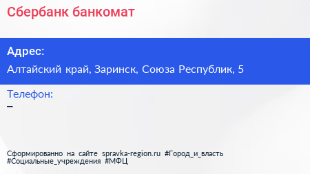 Сбербанк, банкомат по адресу Алтайский край, Заринск, Союза Республик, 5 в дальнейшем Организация, размещена в следующих категориях: