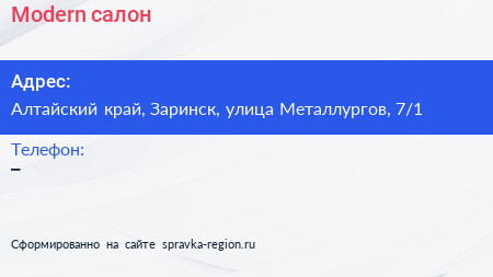 Modern, салон по адресу Алтайский край, Заринск, улица Металлургов, 7/1 в дальнейшем Организация, размещена в следующих категориях: