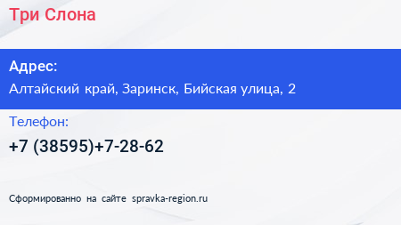 Три Слона по адресу Алтайский край, Заринск, Бийская улица, 2 в дальнейшем Организация, размещена в следующих категориях: