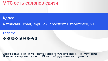 МТС, сеть салонов связи по адресу Алтайский край, Заринск, проспект Строителей, 21 в дальнейшем Организация, размещена в следующих категориях: