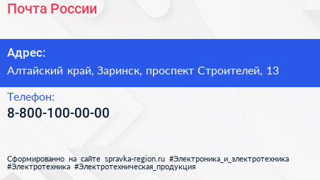 Почта России по адресу Алтайский край, Заринск, проспект Строителей, 13 в дальнейшем Организация, размещена в следующих категориях:
