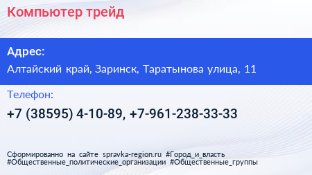 Компьютер-трейд по адресу Алтайский край, Заринск, Таратынова улица, 11 в дальнейшем Организация, размещена в следующих категориях: