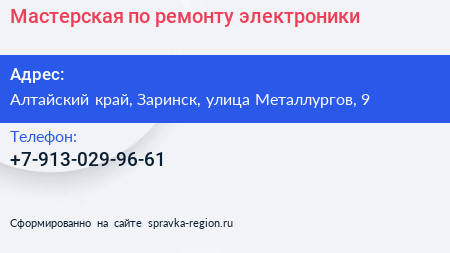 Мастерская по ремонту электроники по адресу Алтайский край, Заринск, улица Металлургов, 9 в дальнейшем Организация, размещена в следующих категориях: