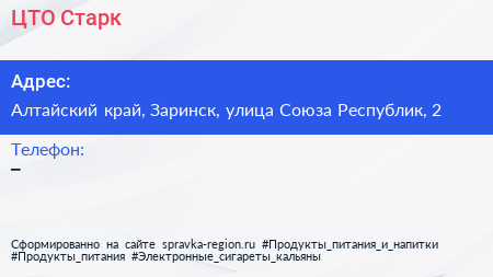 ЦТО Старк по адресу Алтайский край, Заринск, улица Союза Республик, 2 в дальнейшем Организация, размещена в следующих категориях: