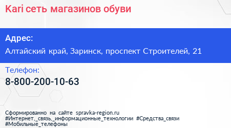 Kari, сеть магазинов обуви по адресу Алтайский край, Заринск, проспект Строителей, 21 в дальнейшем Организация, размещена в следующих категориях: