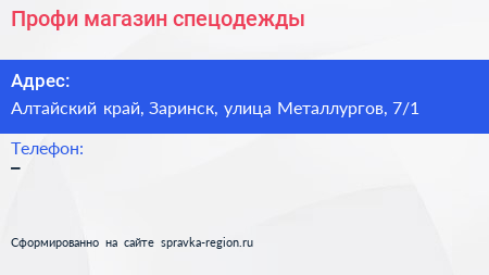 Профи, магазин спецодежды по адресу Алтайский край, Заринск, улица Металлургов, 7/1 в дальнейшем Организация, размещена в следующих категориях: