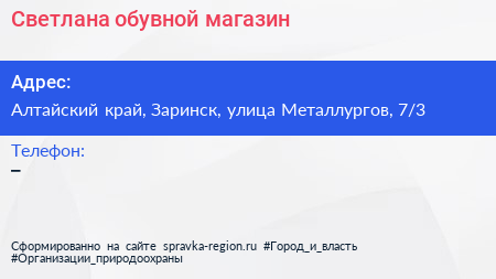 Светлана, обувной магазин по адресу Алтайский край, Заринск, улица Металлургов, 7/3 в дальнейшем Организация, размещена в следующих категориях: