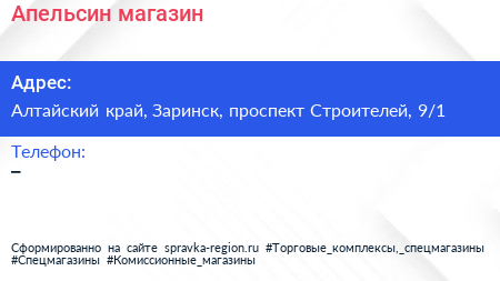 Апельсин, магазин по адресу Алтайский край, Заринск, проспект Строителей, 9/1 в дальнейшем Организация, размещена в следующих категориях: